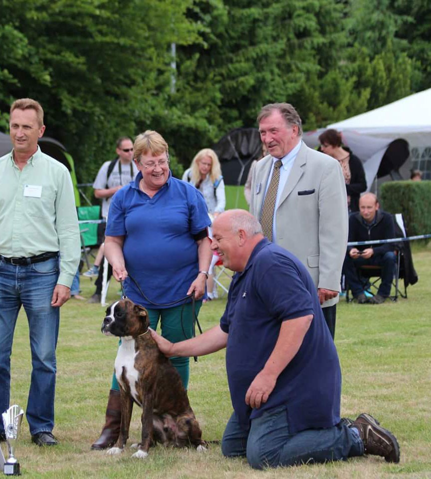 Dagelijks trippelen er twee reuen en twee pups door het huis van Fred. Zowel de volwassen honden als pups komen uit eigen fok. De puppies hebben Russisch bloed. ‘Ik noem de pups ook wel de Pussy Riot van Nederland. Ze spelen met elkaar alsof ze zusjes zijn, maar ze komen uit verschillende nestjes. Belangrijk is om van jongs af aan consequent te zijn en met ze te trainen. Anders gaan ze zich vervelen. Uit ervaring kan ik spreken dat je meubilair daaronder kan lijden. Voor de trainingen heb je flink wat geduld nodig. Meer dan bij een herder bijvoorbeeld. Tijdens trainingen hoorde ik vaak ‘oh nee, weer zo’n lastige boxer’. Maar als ze eenmaal het nut van een oefening inzien, gaan ze er keihard voor.’Fokken met visie